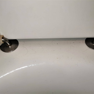 (1) Die Toilettenschüssel: Im Prinzip sollte die gesamte Oberfläche sauber gehalten werden (KEINEN EINZIGEN QUADRATCENTIMETER AUSLASSEN), aber in der Praxis wird dies leider von den meisten Menschen vernachlässigt. Warum nicht einfach das Innere reinigen? Denn das Wasser und die Pisse, die sich absetzen, laufen an den Rändern hinunter und trocknen dort, so dass sich an der Unterseite von Tassen oder Urinalen Wasser- und Pisssteine bilden, oft in unglaublichem Ausmaß! (Öffnen Sie es und zoomen Sie hinein!) Die horizontalen Flächen des Steingutes, wie z. B. die Stellen, an denen die Sitzfläche befestigt ist, oder die Stellen, an denen der Keramikkörper mit dem Boden verschraubt ist, sind ebenfalls ein guter Platz für den Schmutz, denn hier kommen zu den oben erwähnten Formationen noch Staub und Haare hinzu. Wenn sich an der Rückseite des Bechers ein Abwasserauslass befindet, sind das Verbindungsrohr und natürlich das Rohr, das das saubere Wasser führt, ebenfalls gute Staubfänger.